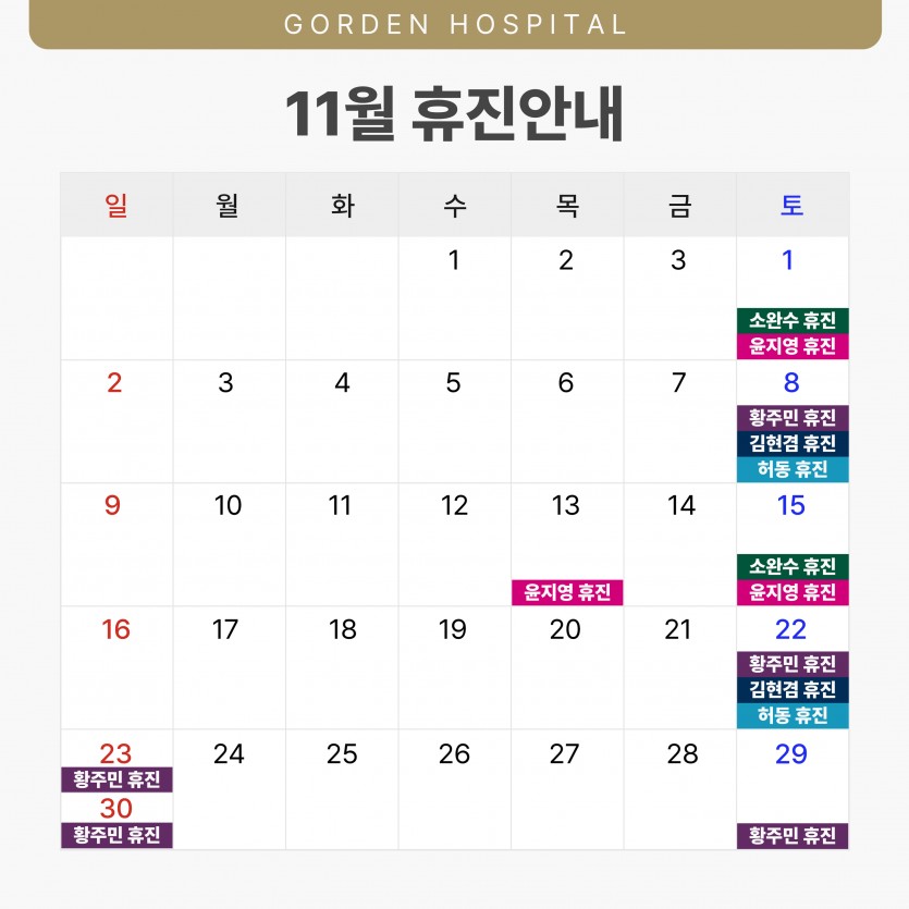 2025년 11월 진료과 휴진일정 고든병원 0 10.27 12:24 안녕하세요 고든병원입니다.2025년 11월 진료과 휴진일정 안내해 드립니다.신경외과· 황주민 원장: 8일(토), 22일(토), 23일(일), 30일(일)· 소완수 원장: 1일(토), 15일(토)정형외과· 윤지영 원장: 1일(토), 13일(목), 15일(토)· 김현겸 원장: 8일(토), 22일(토)· 허동 원장: 8일(토), 22일(토)내과· 최연우 원장: 휴진 없음진료 예약 및 내원에 참고 부탁드립니다