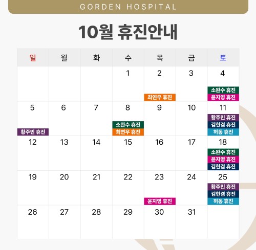 안녕하세요 고든병원입니다.2025년 10월 진료과 휴진일정 안내해 드립니다.신경외과· 황주민 원장: 5일(일), 11일(토), 25일(토)· 소완수 원장: 4일(토), 8일(수), 18일(토)정형외과· 윤지영 원장: 4일(토), 23일(목)· 김현겸 원장: 11일(토), 18일(토), 25일(토)· 허동 원장: 11일(토), 25일(토)내과· 최연우 원장: 2일(목), 8일(수)진료 예약 및 내원에 참고 부탁드립니다.