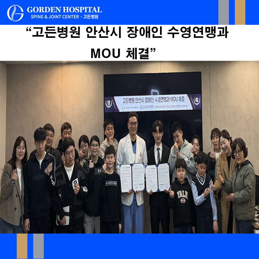 안산고든병원, 안산시 장애인 수영연맹과 의료지원 업무협약 체결 고든병원 0 9시간전 안산고든병원은 안산시 장애인 수영연맹과 의료지원 업무협약(MOU)을 체결하며 지역 체육 발전과 선수들의 건강 관리 지원에 나섰습니다.이날 협약식에는 장애인 수영 선수들과 청소년 선수들도 함께 참석해 더욱 의미 있는 자리가 되었으며, 선수들의 건강한 훈련과 경기 활동을 위한 의료 협력 체계를 구축하게 되었습니다.안산고든병원은 앞으로도 지역 스포츠 발전과 선수들의 건강을 위한 의료 지원을 이어가겠습니다.